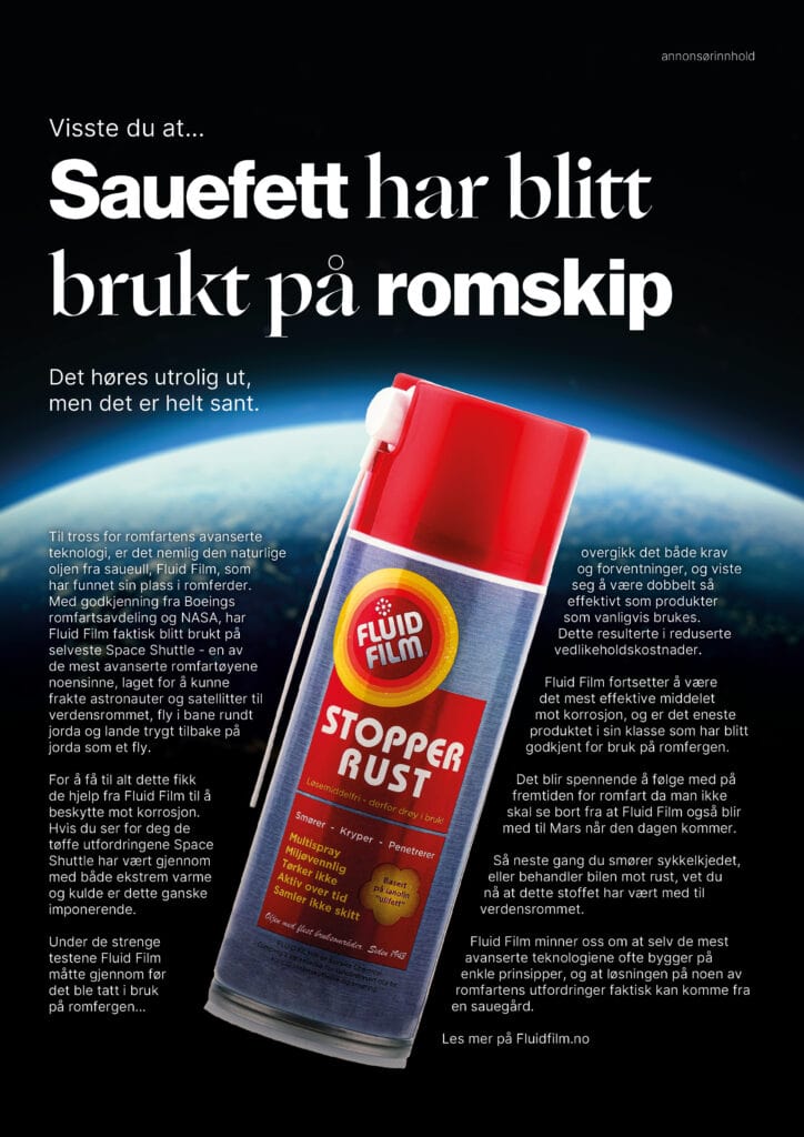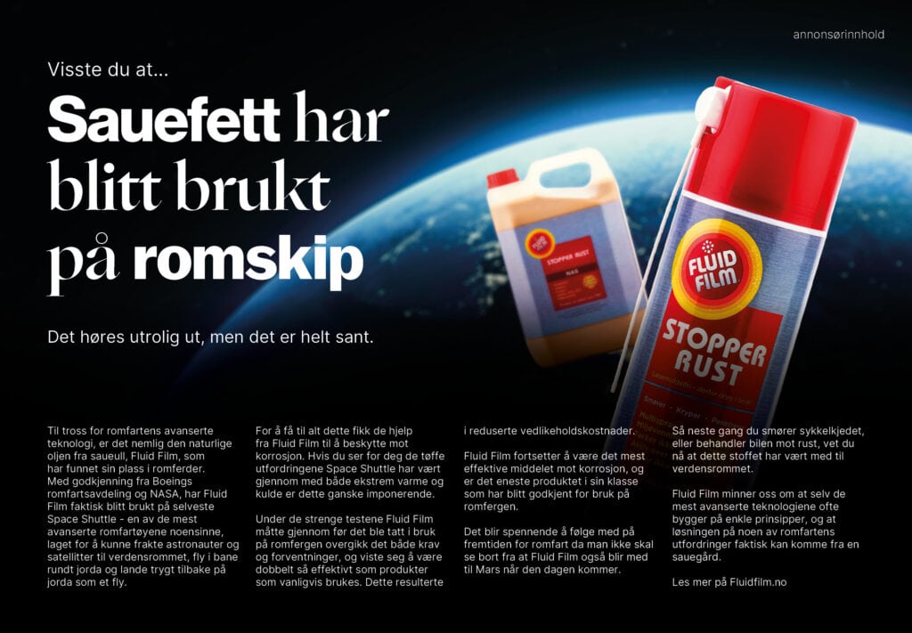 Til tross for romfartens avanserte teknologi, er det nemlig den naturlige oljen fra saueull, Fluid Film, som har funnet sin plass i romferder. Med godkjenning fra Boeings romfartsavdeling og NASA, har Fluid Film faktisk blitt brukt på selveste Space Shuttle – en av de mest avanserte romfartøyene noensinne, laget for å kunne frakte astronauter og satellitter til verdensrommet, fly i bane rundt jorda og lande trygt tilbake på jorda som et fly.